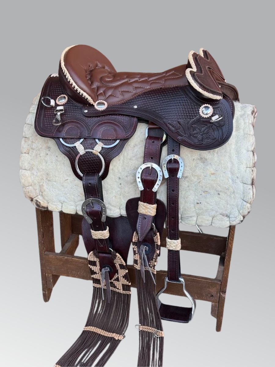 Arreio produzido artesanalmente com detalhes exclusivos. Conta com a traseira e cabeça com tranças em couro cru e rebaixos entalhados.