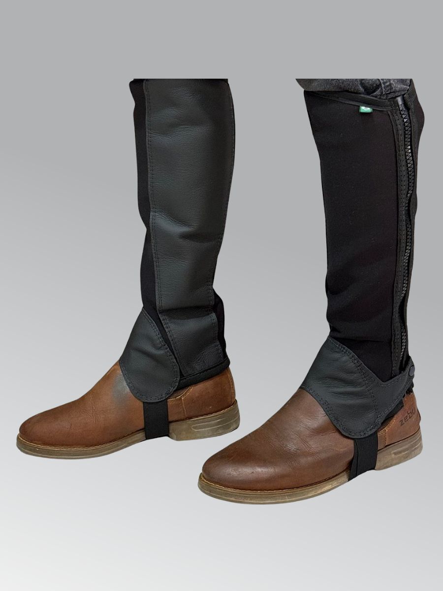 Perneira confeccionada em Neoprene de alta qualidade, com proteção em couro vaqueta na parte interna da perneira, possui fechamento em ziper e botão na parte inferior. Possui também elástico duplo na parte inferior para fixação no calçado.