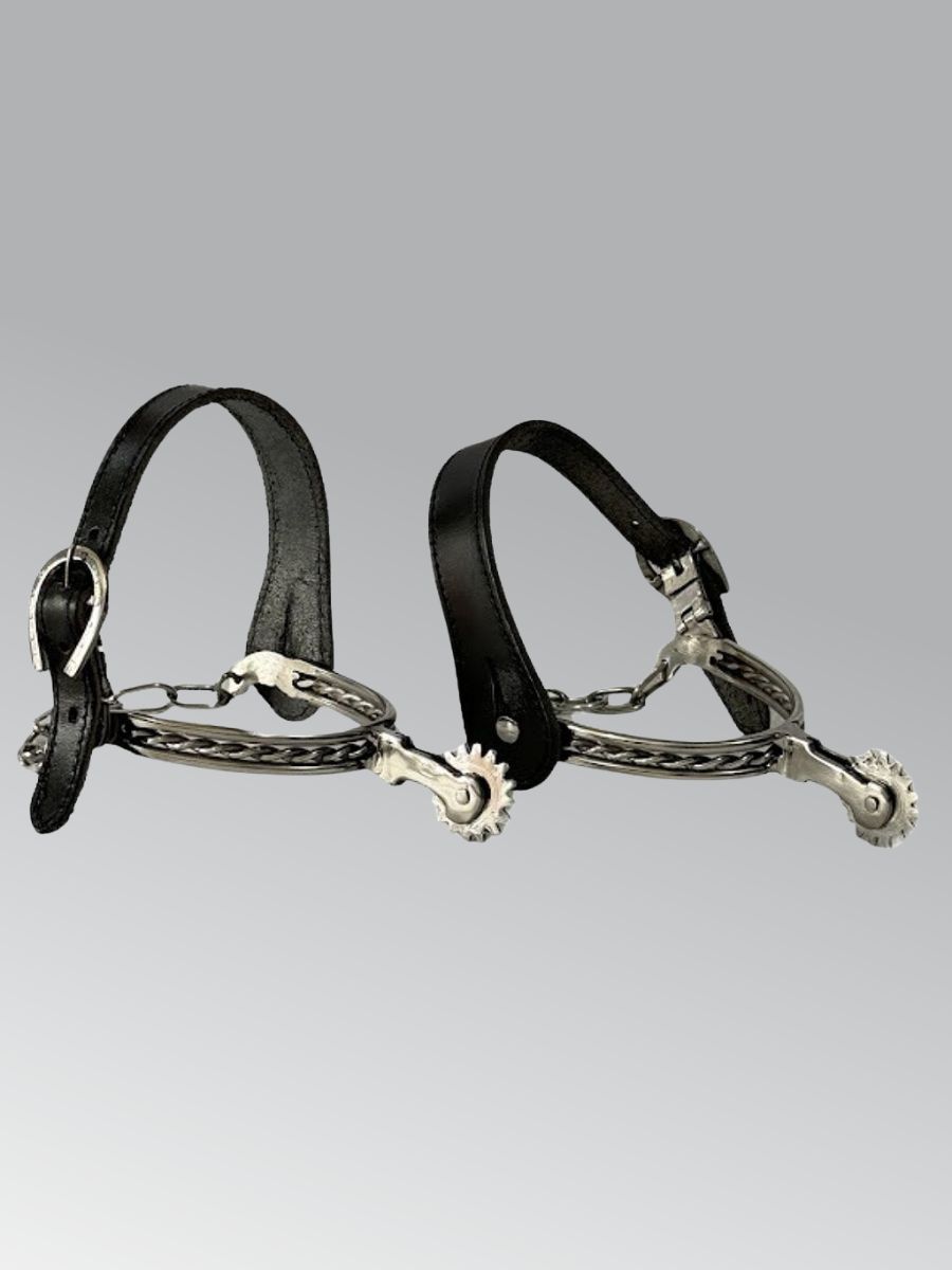 Espora Inox Mangalarga, fabricada em aço inox, livre de ferrugens. Detalhe em aço inox torcido fino acabamento. Cão com 5,5cm de profundidade por 9cm de largura para ajuste na bota.