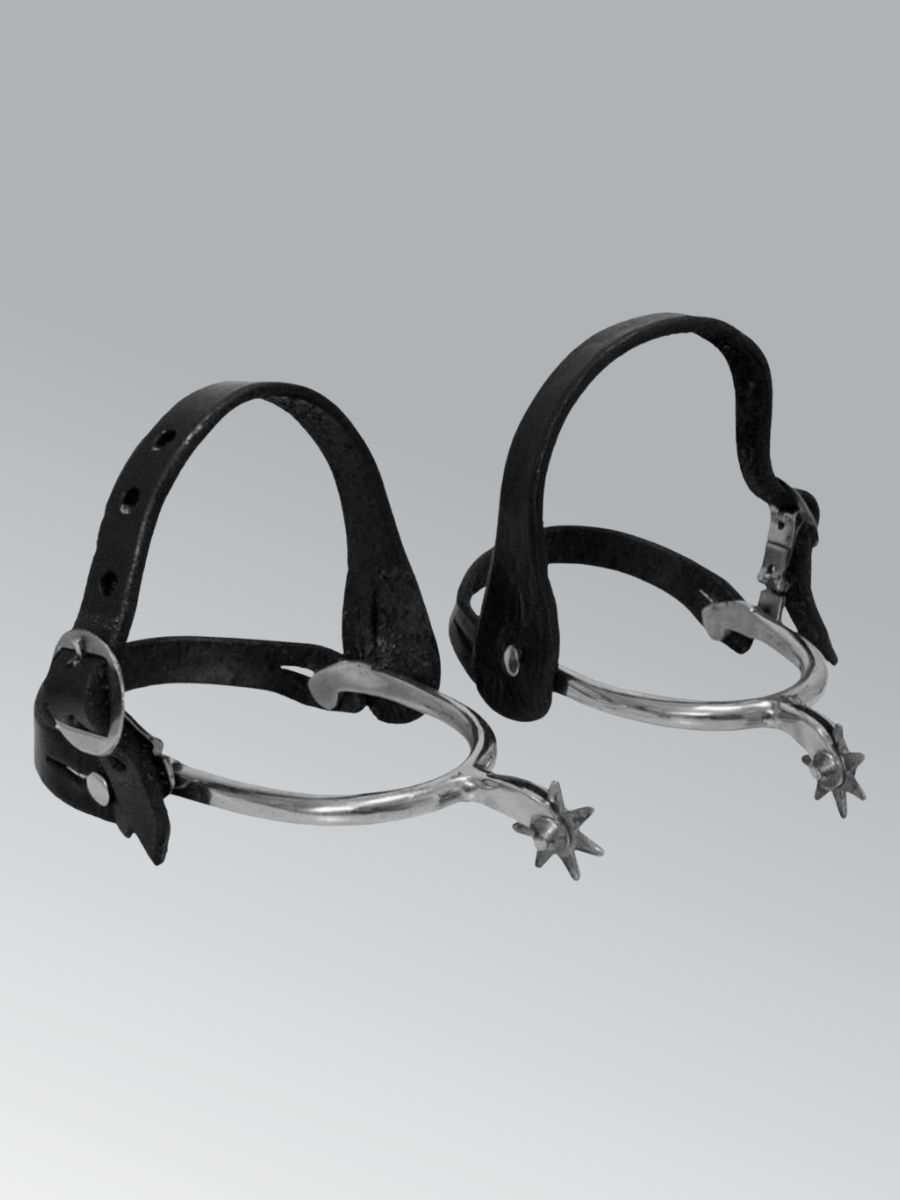 Espora roliça, fabricada em aço inox, livre de ferrugens. Cão com 2,5 polegadas de profundidade por 3 polegadas de largura. Roseta maior, com 7 bicos. Acompanha correias em couro.