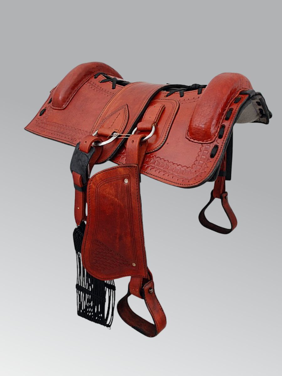 Arreio Banana completo, muito flexível, fabricado em couro legítimo com detalhes em rebaixo, trançados com fita cadarço, argolas e meia argolas em inox, suadores de feltro com enchimento de capim.