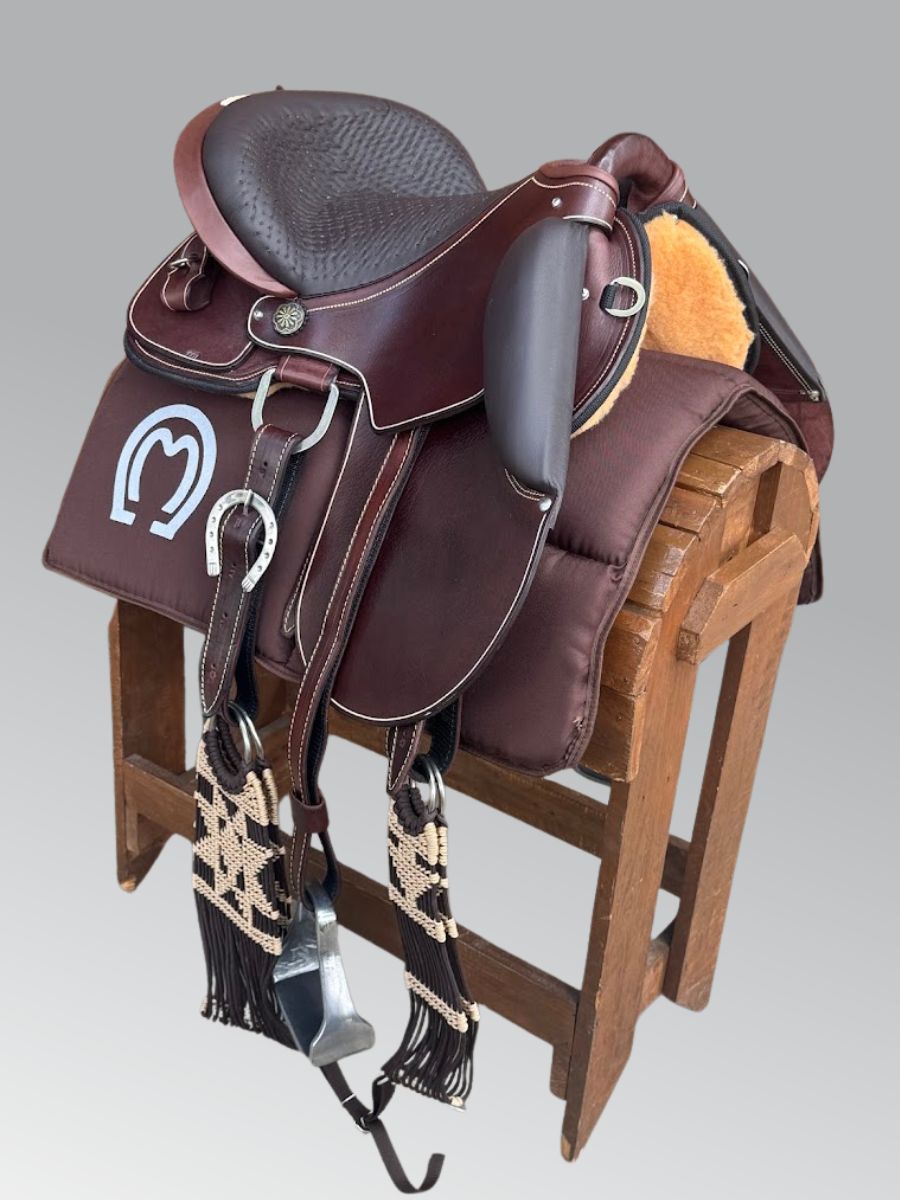 Sela para Concurso de Marcha, passeios e cavalgadas fabricada em legítimo couro de búfalo. Assento em couro nobuck acolchoado e espuma de alta densidade (D-60). Armação em fibra de vidro para redução do peso e aumento da resistência. Suadores em neoprene. Detalhes Trançados no assento da sela (revirão) dando um acabamento único, possui a traseira no estilo da sela rancheira oque proporciona um visual diferenciado para a sela, ferragens em aço inox de alta qualidade, possui também apliques. Abas com borrainas altas revestidas em nobuck para maior conforto durante a montaria, posicionadas para encaixe perfeito da perna sobre a aba. Sela profissional para concursos de marcha podendo ser utilizada na maioria das raças.