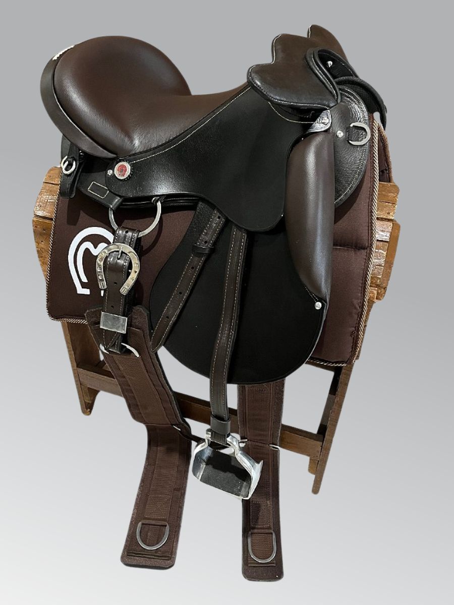 Sela De Cabeça, completa, fabricada em legítimo couro, criteriosamente selecionado, tratado com óleo de mocotó, proporcionando maior resistência do couro e prolongando a vida útil do produto. Composta de argolas e fivelas em aço inox, de altíssima qualidade, livre de ferrugens. Armação altamente resistente com estrutura de fibra de vidro. Assento em couro vaqueta revestido sobre espuma de alta densidade D-60 e suadores de neoprene. Produto com fino acabamento, prático, resistente, bonito e de fácil fixação no animal. Produto versátil, podendo ser utilizado na maioria das raças.