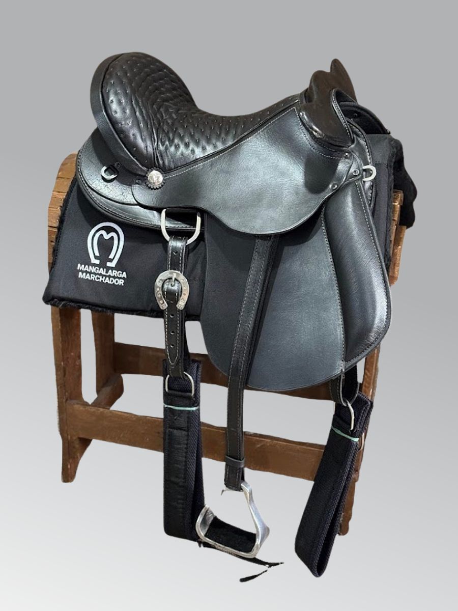 Produzida em couro legítimo, tratado e selecionado. Armação de fibra epóxi que torna a sela além de leve, muito resistente. Meia argolas e fivelas em aço inox de primeira qualidade, livre de ferrugens. Arreamento em couro forrado. Assento de couro vaqueta acolchoado com espuma de alta densidade D-60.