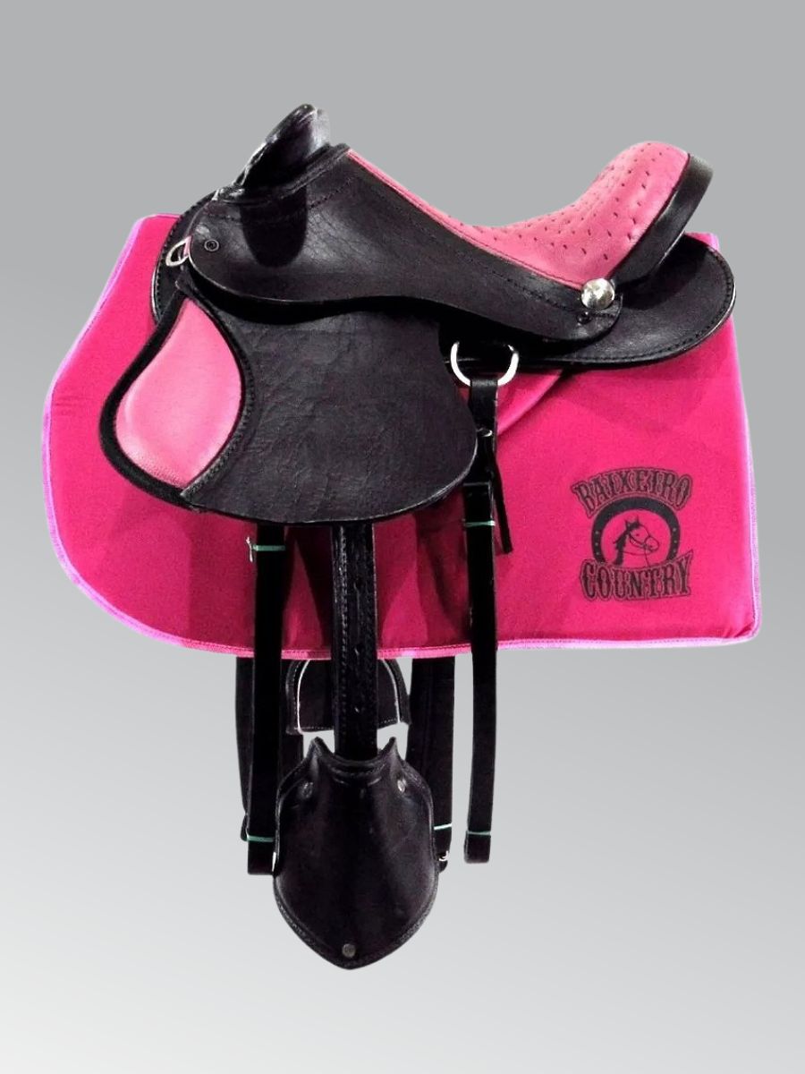 Sela infantil, completa, fabricada em legítimo couro, criteriosamente selecionado, tratado com óleo de mocotó, proporcionando maior resistência do couro e prolongando a vida útil do produto. Composta de argolas e fivelas em aço inox, de altíssima qualidade, livre de ferrugens. Armação altamente resistente com estrutura de fibra epoxi. Assento em couro vaqueta sobresposto a uma espuma de alta densidade D-60 e suadores de feltro. Produto com fino acabamento, prático, resistente, bonito e de fácil fixação no animal. Produto versátil, podendo ser utilizado na maioria das raças.