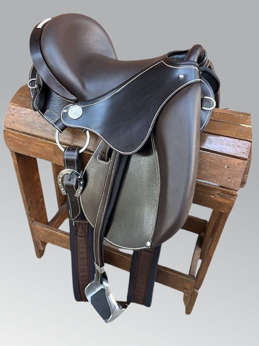 Sela completa, fabricada em legítimo couro legítimo de búfalo, criteriosamente selecionado, tratado com óleo de mocotó, proporcionando maior resistência do couro e prolongando a vida útil do produto. Composta de argolas e fivelas em aço inox, de altíssima qualidade, livre de ferrugens. Armação altamente resistente com estrutura de fibra epoxi. Assento em couro vaqueta sobresposto a uma espuma de alta densidade D-60 e suadores de neoprene. Produto com fino acabamento, prático, resistente, bonito e de fácil fixação no animal. Produto versátil, podendo ser utilizado na maioria das raças.