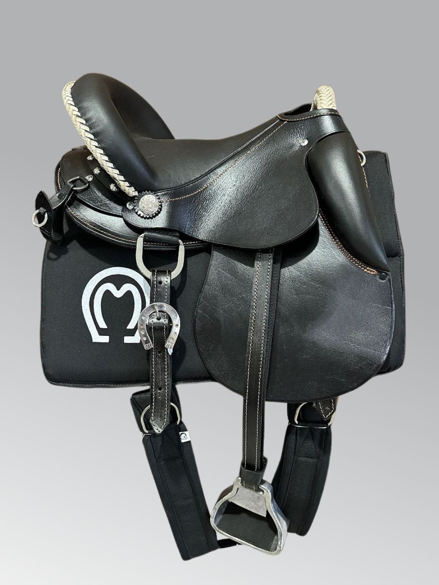 Uma sela desenvolvida para ser usada em pistas e competições além de passeios e cavalgadas. Gancho e revirão com acabamento em couro cru traçado. Assento anatômico super confortável e acabamento profissional.